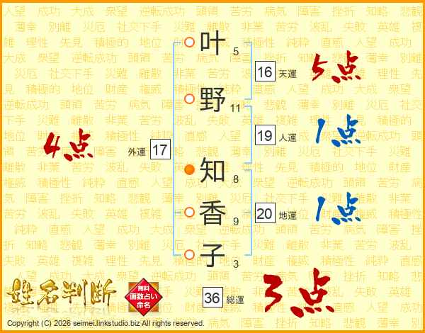 叶野知香子さんの総運は36画の3点!
