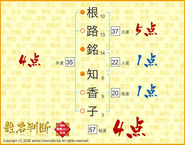 根(10画)路(13画)銘(14画) 知(8画)香(9画)子(3画)
