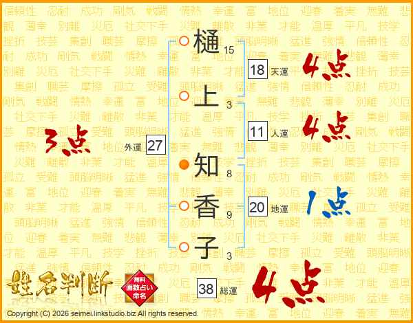 樋(15画)上(3画) 知(8画)香(9画)子(3画)