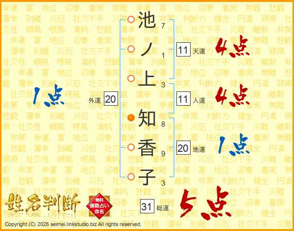 池(7画)ノ(1画)上(3画) 知(8画)香(9画)子(3画)