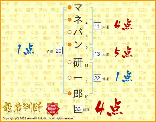 マ(2画)ネ(4画)パ(3画)ン(2画) 研(11画)一(1画)郎(10画)