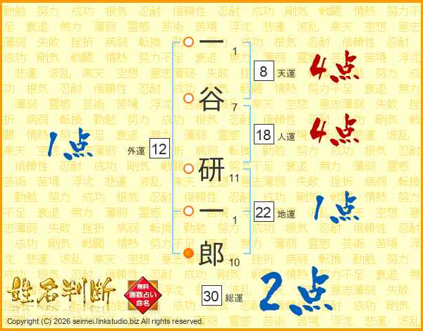 一(1画)谷(7画) 研(11画)一(1画)郎(10画)