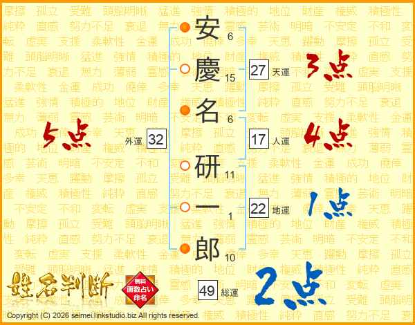 安(6画)慶(15画)名(6画) 研(11画)一(1画)郎(10画)