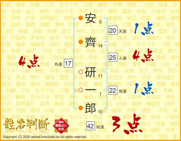 安(6画)齊(14画) 研(11画)一(1画)郎(10画)