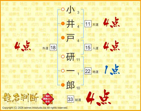小(3画)井(4画)戸(4画) 研(11画)一(1画)郎(10画)