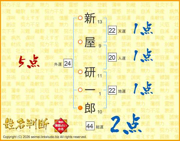 新屋研一郎さんの総運は44画の2点!