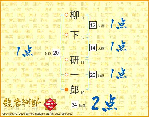 柳(9画)下(3画) 研(11画)一(1画)郎(10画)