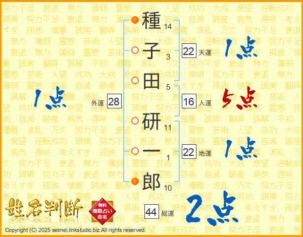 種(14画)子(3画)田(5画) 研(11画)一(1画)郎(10画)