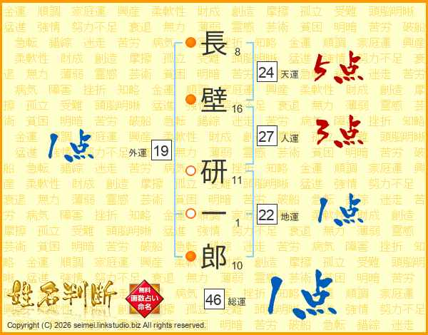 長(8画)壁(16画) 研(11画)一(1画)郎(10画)