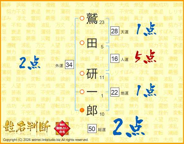 鷲(23画)田(5画) 研(11画)一(1画)郎(10画)