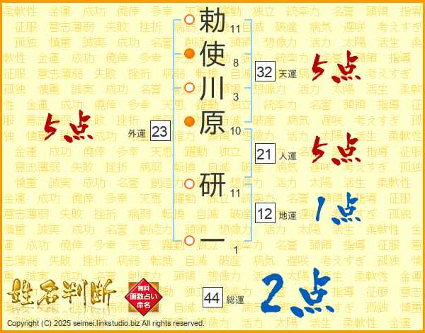 勅(11画)使(8画)川(3画)原(10画) 研(11画)一(1画)