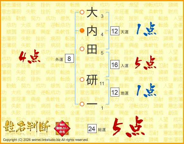 大(3画)内(4画)田(5画) 研(11画)一(1画)