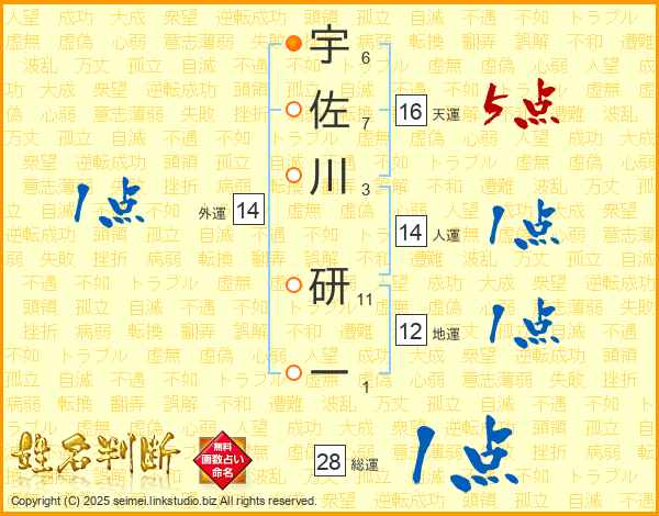 宇(6画)佐(7画)川(3画) 研(11画)一(1画)
