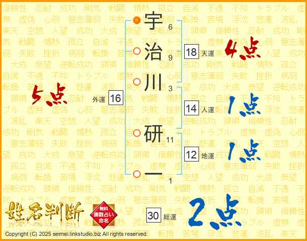 宇治川研一さんの総運は30画の2点!