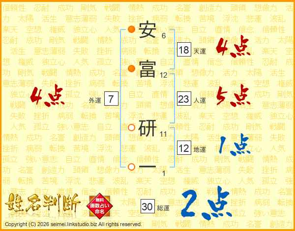 生活面を象徴する運勢です。外部から受ける影響力を表し、結婚運、家庭運や職場、環境への順応性を表します。総運から人運を引いた画数。姓や名が1文字の場合を除く。