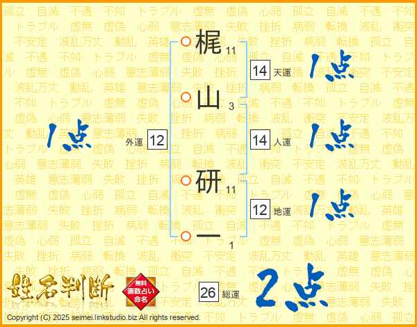 生活面を象徴する運勢です。外部から受ける影響力を表し、結婚運、家庭運や職場、環境への順応性を表します。総運から人運を引いた画数。姓や名が1文字の場合を除く。