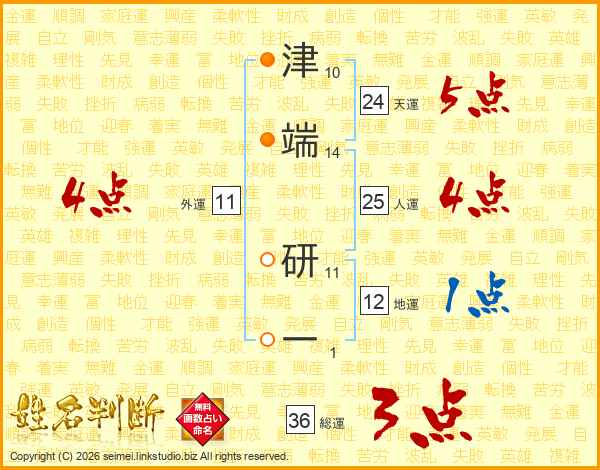 津(10画)端(14画) 研(11画)一(1画)