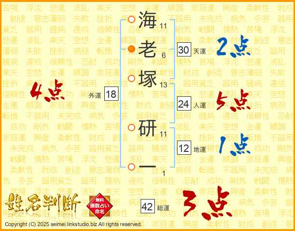 海(11画)老(6画)塚(13画) 研(11画)一(1画)