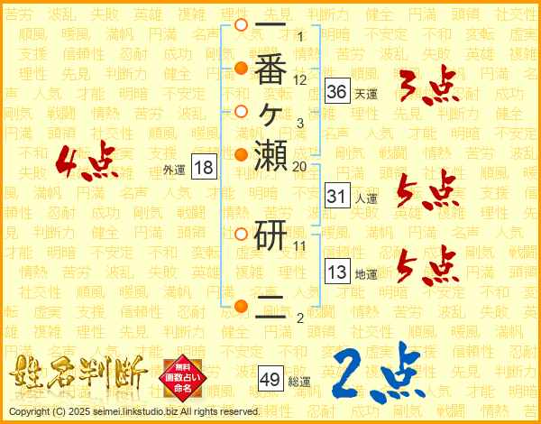 一(1画)番(12画)ヶ(3画)瀬(20画) 研(11画)二(2画)