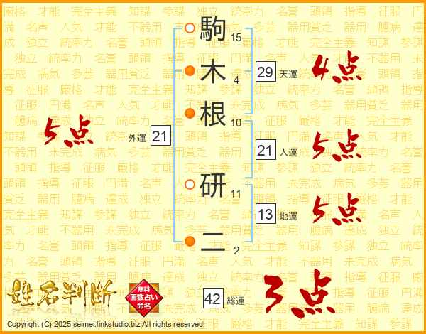駒(15画)木(4画)根(10画) 研(11画)二(2画)