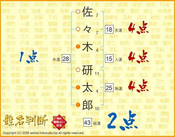 佐々木研太郎さんの地運は25画の4点!