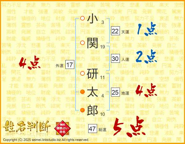 小(3画)関(19画) 研(11画)太(4画)郎(10画)
