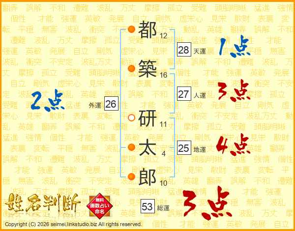 都(12画)築(16画) 研(11画)太(4画)郎(10画)