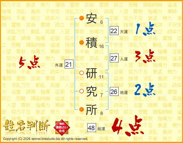 安(6画)積(16画) 研(11画)究(7画)所(8画)