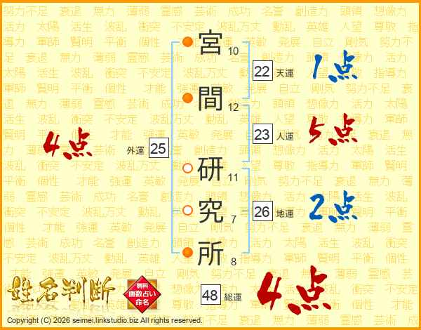 宮(10画)間(12画) 研(11画)究(7画)所(8画)