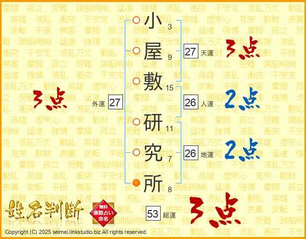 小(3画)屋(9画)敷(15画) 研(11画)究(7画)所(8画)