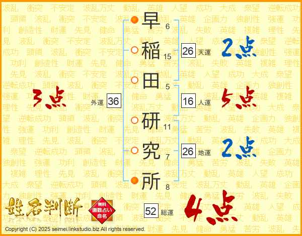 早(6画)稲(15画)田(5画) 研(11画)究(7画)所(8画)
