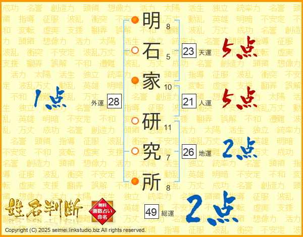 あなたの人生を表す1番重要な運勢です。生涯を通じて影響する総合運となり、主に50歳以降の晩年期に影響を及ぼします。苗字と名前の合計画数。