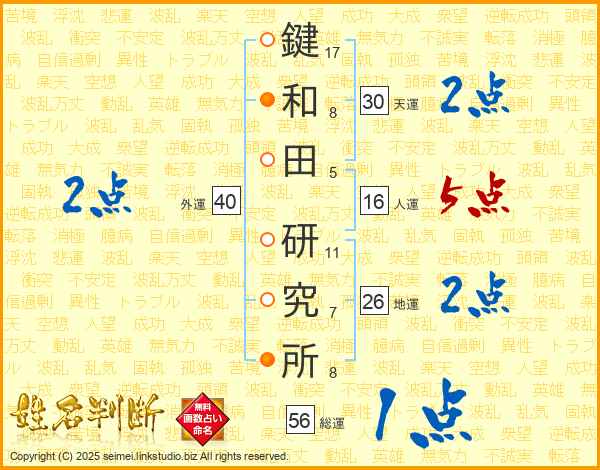 鍵(17画)和(8画)田(5画) 研(11画)究(7画)所(8画)