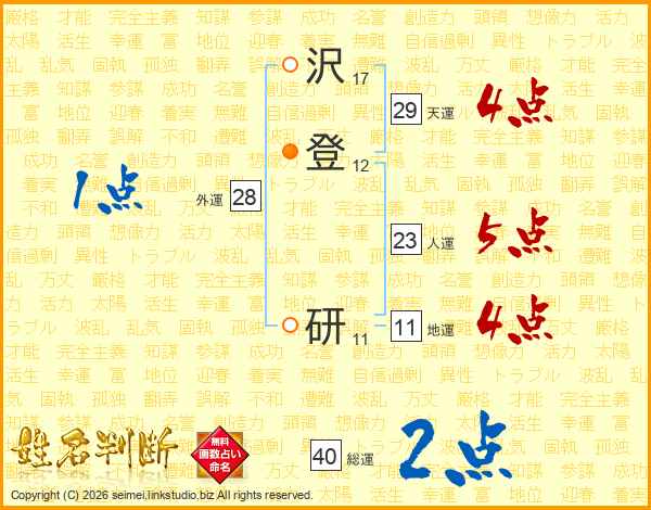 沢(17画)登(12画) 研(11画)