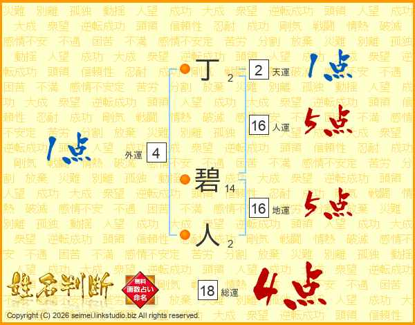 あなたの人生を表す1番重要な運勢です。生涯を通じて影響する総合運となり、主に50歳以降の晩年期に影響を及ぼします。苗字と名前の合計画数。