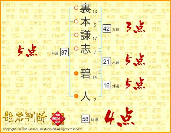 裏本謙志碧人さんの総運は58画の4点!
