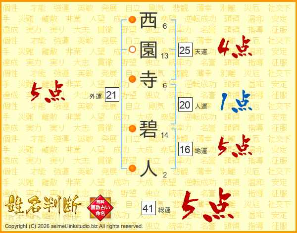 西(6画)園(13画)寺(6画) 碧(14画)人(2画)