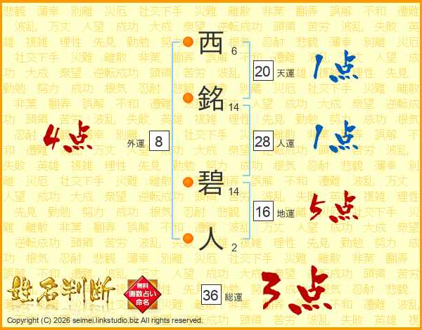 生活面を象徴する運勢です。外部から受ける影響力を表し、結婚運、家庭運や職場、環境への順応性を表します。総運から人運を引いた画数。姓や名が1文字の場合を除く。