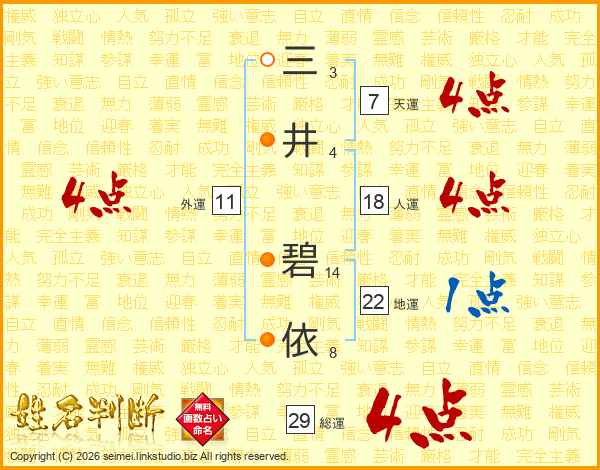 生活面を象徴する運勢です。外部から受ける影響力を表し、結婚運、家庭運や職場、環境への順応性を表します。総運から人運を引いた画数。姓や名が1文字の場合を除く。
