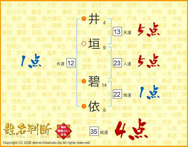 生活面を象徴する運勢です。外部から受ける影響力を表し、結婚運、家庭運や職場、環境への順応性を表します。総運から人運を引いた画数。姓や名が1文字の場合を除く。