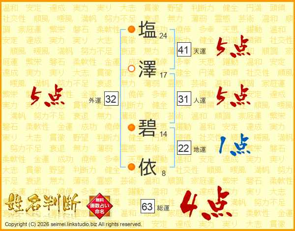 塩(24画)澤(17画) 碧(14画)依(8画)