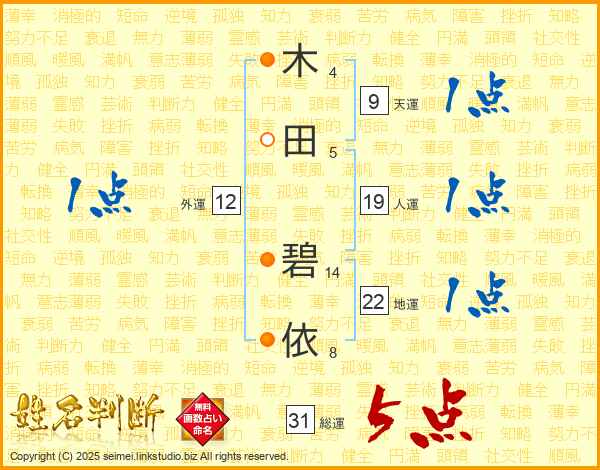 生活面を象徴する運勢です。外部から受ける影響力を表し、結婚運、家庭運や職場、環境への順応性を表します。総運から人運を引いた画数。姓や名が1文字の場合を除く。