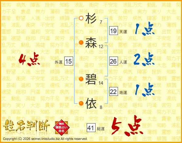 あなたの人生を表す1番重要な運勢です。生涯を通じて影響する総合運となり、主に50歳以降の晩年期に影響を及ぼします。苗字と名前の合計画数。