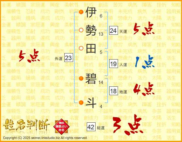 伊(6画)勢(13画)田(5画) 碧(14画)斗(4画)