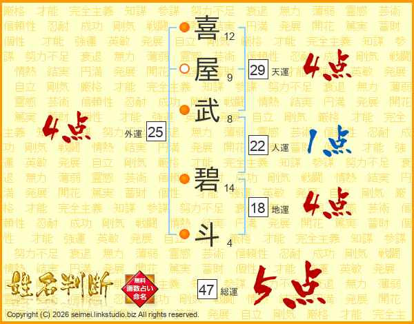 喜(12画)屋(9画)武(8画) 碧(14画)斗(4画)