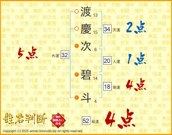渡(13画)慶(15画)次(6画) 碧(14画)斗(4画)