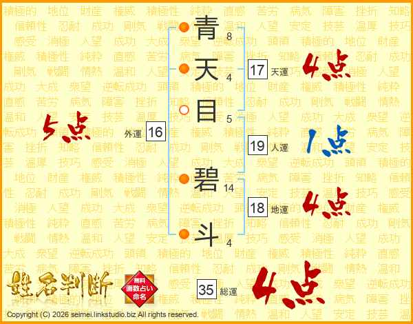 青(8画)天(4画)目(5画) 碧(14画)斗(4画)