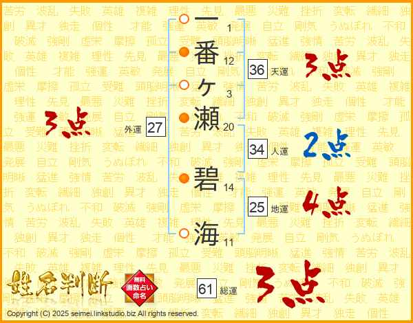 一番ヶ瀬碧海さんの地運は25画の4点!