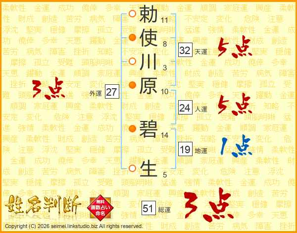 勅(11画)使(8画)川(3画)原(10画) 碧(14画)生(5画)