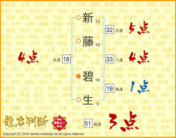 あなたの人生を表す1番重要な運勢です。生涯を通じて影響する総合運となり、主に50歳以降の晩年期に影響を及ぼします。苗字と名前の合計画数。